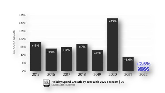 The Adobe Digital Insights report “2022 Holiday Shopping Forecast” recently published estimates that this year’s online holiday-related spend will reach $209.7B, with data showing weaker seasonal sales growth at 2.5% YoY. Currently, Year-to-date growth is at 8% YoY for online retail. The rate of growth started strong in 2022, but the uncertain economic situation has led consumers to buck the trend as the Christmas and Black Friday marketing season approaches.
