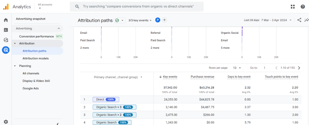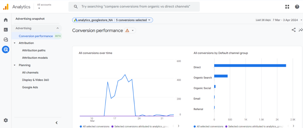 Within GA4, Google Ads conversions are exclusively displayed in the “Advertising” section of reports. From now on, whenever you see any reference to conversions, it will be about those imported into Google Ads. On the other hand, key events are found under the “Attribution” category.